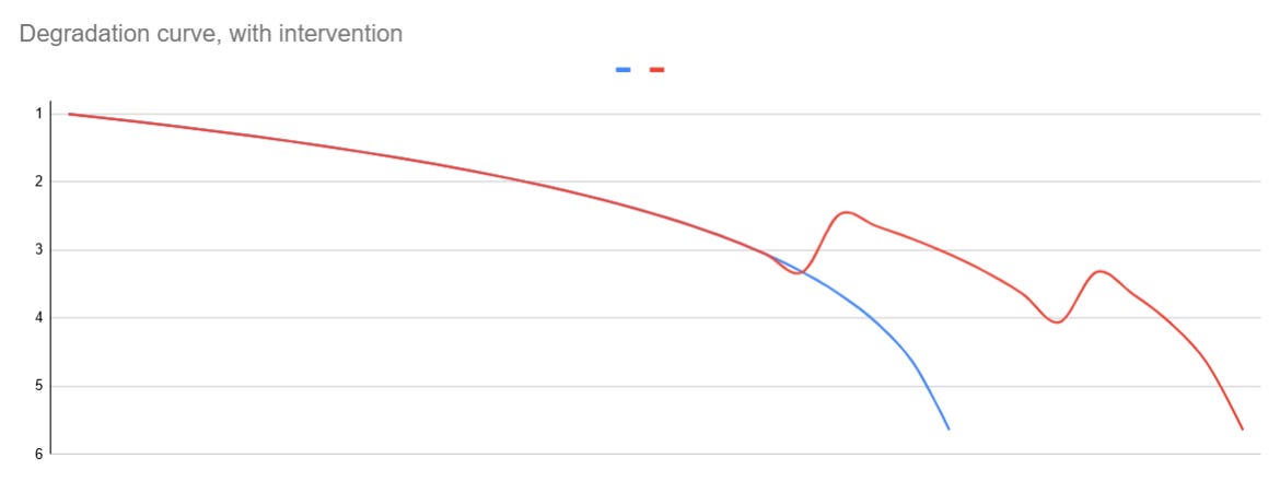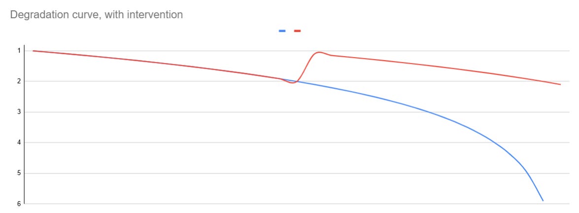 Anyway, back to that curve. Immediately after its construction, the asset or component starts to degrade, but the curve starts more or less anew from the top end. Repeated maintenance thus leads to a jagged line. If you value aesthetics for example, you’ll spend time and money repeatedly in order to keep that shiny ‘as-good-as-new’ status after each intervention. Below an intervention at the halfway point of the life span, restoring to an (almost) as-good-as-new situation: