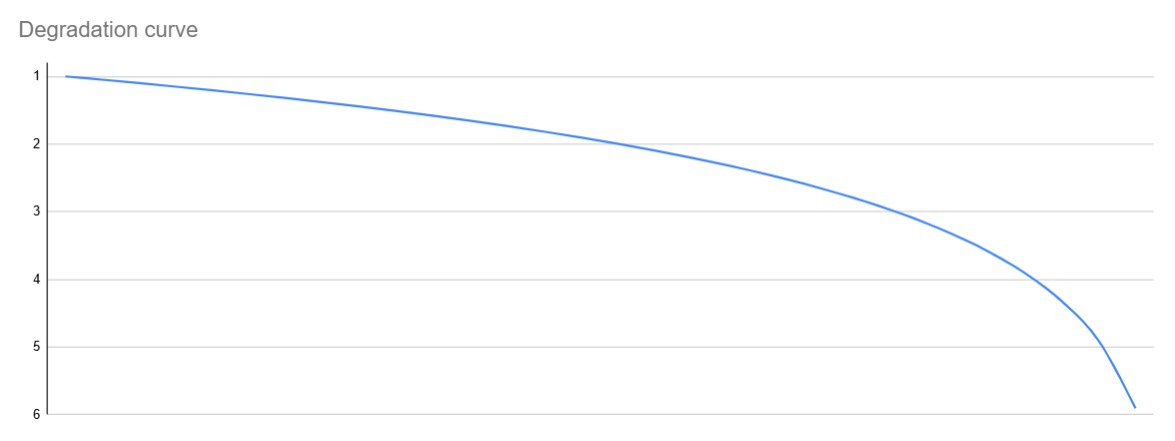 You see, the bits and bobs that your property consists of, do not degrade along a nice straight line. Instead, it’s more or less a curve, of much the same type as Wile E. Coyote missing a turn. It’s all smooth sailing along a gently bending trajectory until midway through its lifespan (the X axis), after which it plummets faster and faster down. Also, without intervention, it will never go up. To illustrate with a quick Google sheet graph using the degradation curve from the maintenance assessor’s handbook of the Dutch government’s Central Government Real Estate Agency, where it is used as a prediction of the technical quality of an unassessed component: